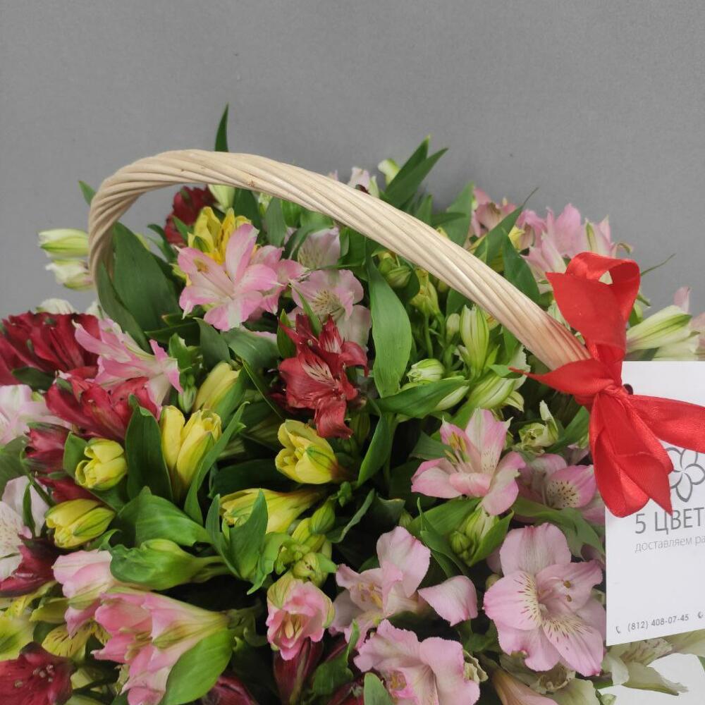 Альстромерия розовая – 8 шт.Альстромерия красная – 9 шт.Альстромерия желтая – 9 шт.Альстромерия белая – 9 шт.корзина с оазисом – 1 шт.