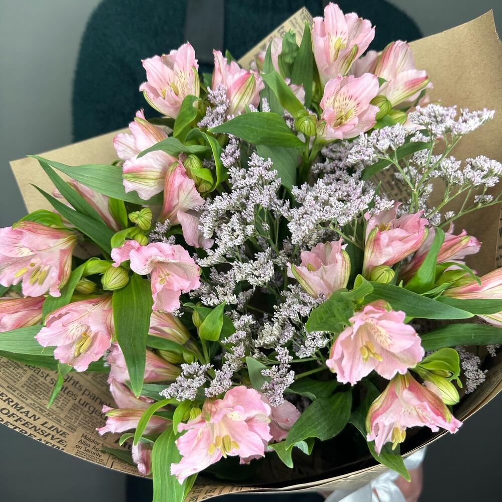 Альстромерия – 5 шт.Лимониум – 2 шт.Лента атласная – 1 шт.Упаковка дизайнерская – 1 шт.
