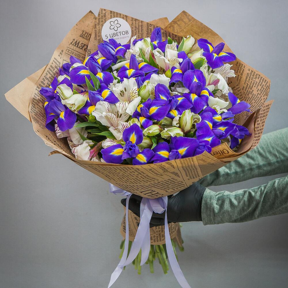 Альстромерия белая – 15 шт.ирисы – 20 шт.Упаковка крафт – 1 шт.Лента атласная – 1 шт.