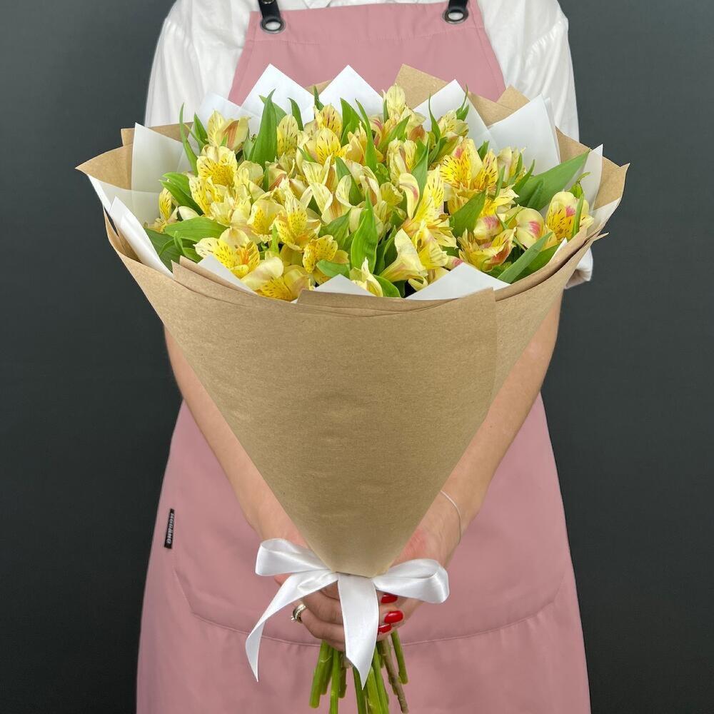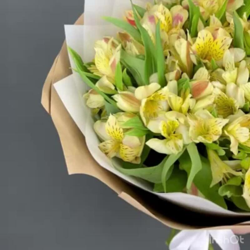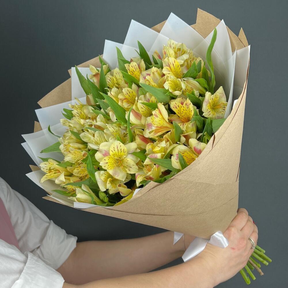 Альстромерия – 15 шт.Лента атласная – 1 шт.бумага крафт – 3 шт.бумага дизайнерская – 3 шт.