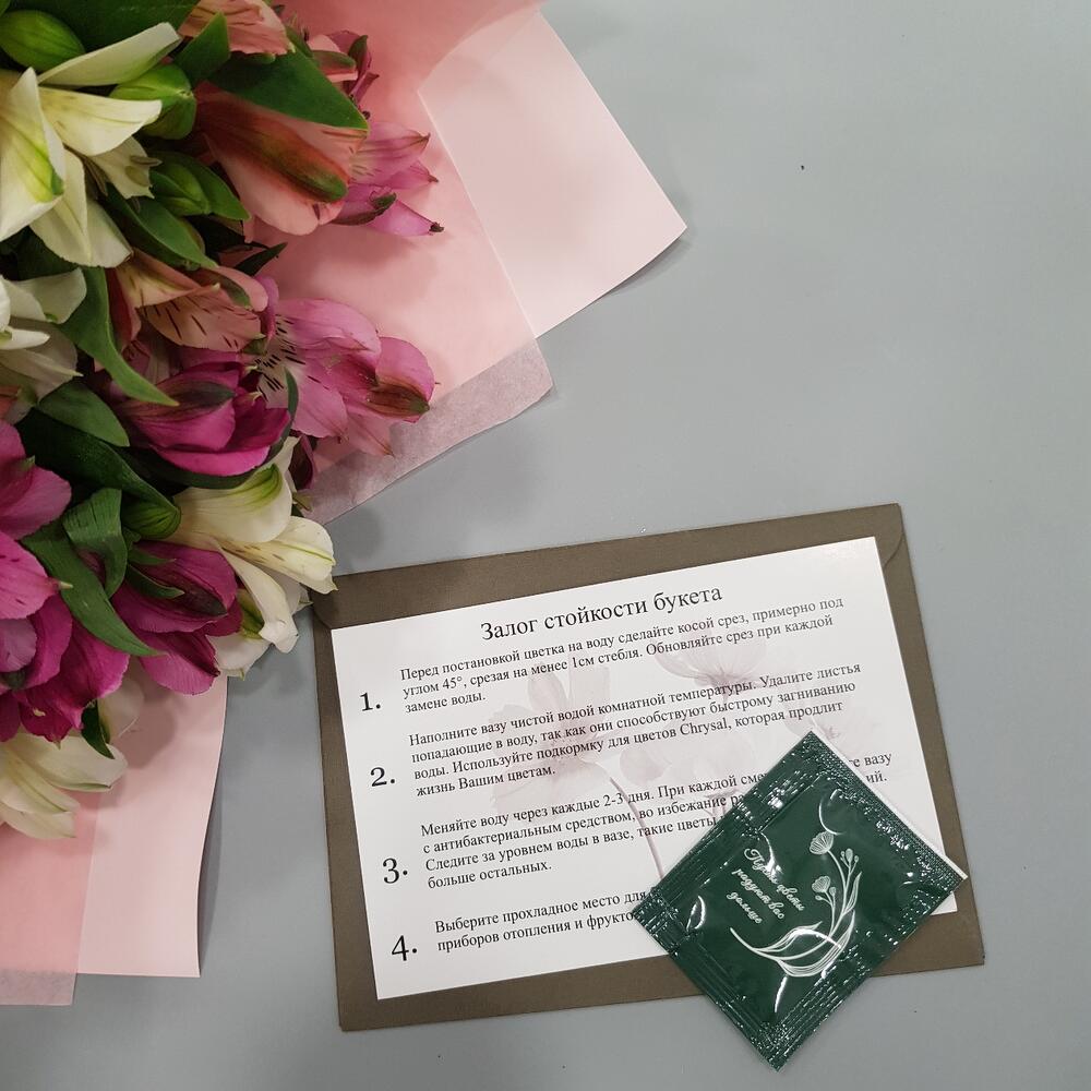 - Сроки возврата: Претензии по качеству букета принимаются в течение 24 часов с момента его получения.