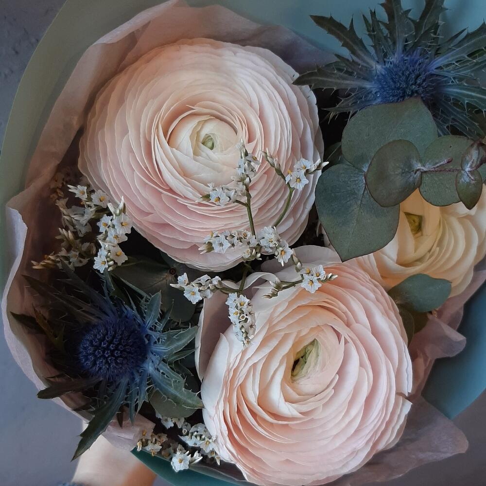ранункулюс экстра ханой – 3 шт.Эрингиум – 1 шт.Эвкалипт – 1 шт.Лимониум – 1 шт.Упаковка дизайнерская – 1 шт.
