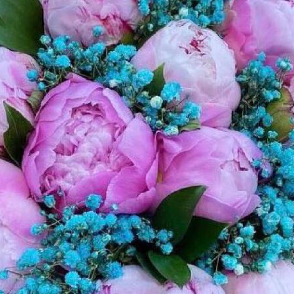 Пион розовый – 11 шт.Гипсофила голубая – 10 шт.Упаковка дизайнерская – 2 шт.Лента атласная – 2 шт.Открыточка с вашими пожеланиями – 1 шт.хорошее настроение – 100 шт.инструкция по уходу за цветами – 1 шт.коробка переноска – 1 шт.Кризал – 1 шт.