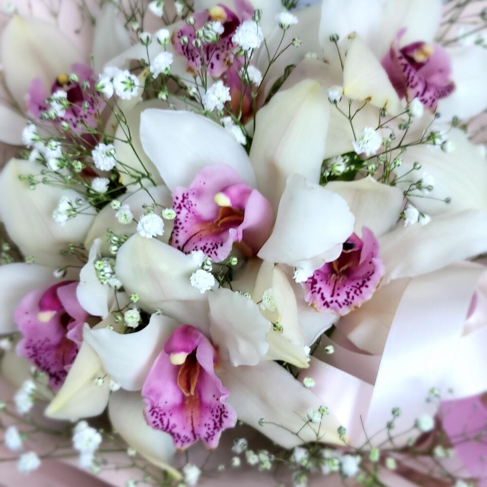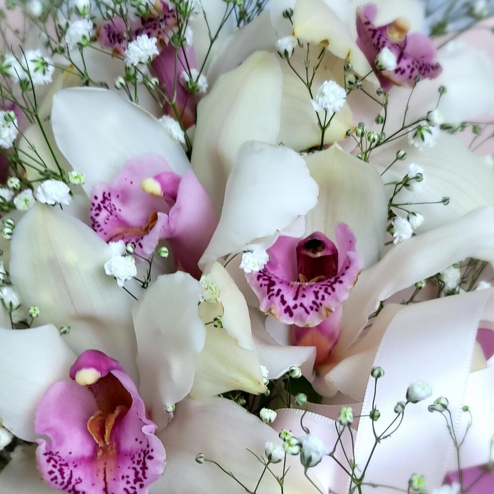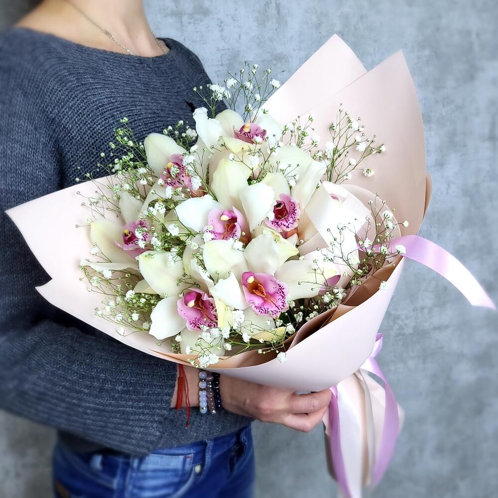 Гипсофила – 2 шт.Орхидея Цимбидиум – 7 шт.Лента атласная – 3 шт.Упаковка дизайнерская – 1 шт.