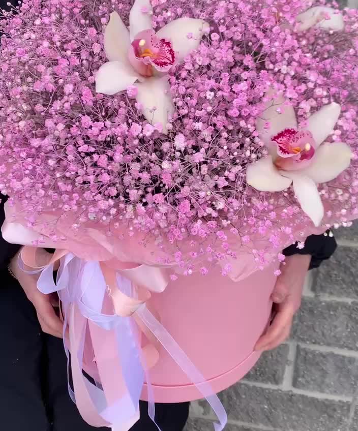 Гипсофила – 10 шт.Орхидея Цимбидиум – 3 шт.Коробка шляпная – 1 шт.Оазис флористический – 2 шт.Пленка матовая – 1 шт.Тишью – 3 шт.Лента атласная – 4 шт.