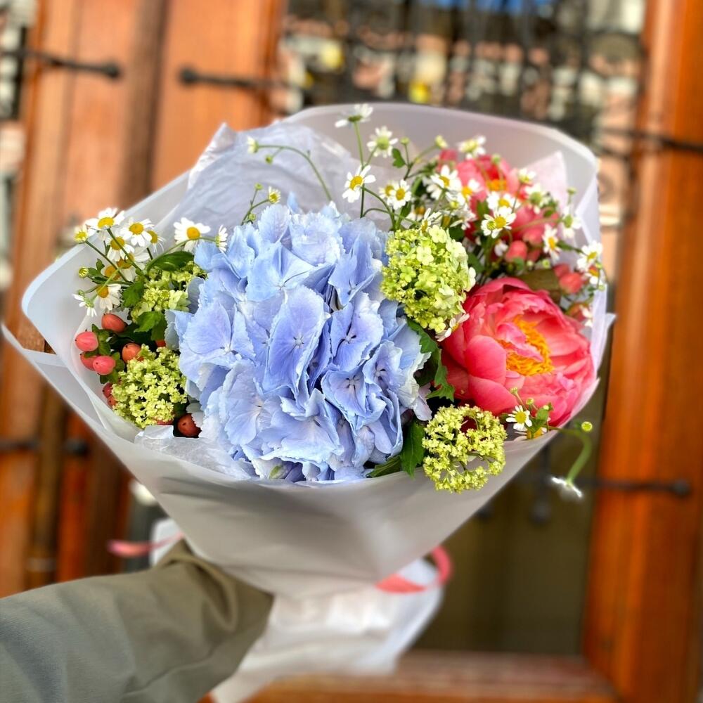 Матрикария – 1 шт.Вибурнум – 1 шт.Озотамнус – 2 шт.Гортензия – 1 шт.Открыточка с вашими пожеланиями – 1 шт.Шоколадка – 1 шт.Пион коралл шарм – 2 шт.Дизайнерская упаковка – 1 шт.подкормка для срезанных цветов – 1 шт.инструкция по уходу за цветами – 1 шт.транспортировочный бокс – 1 шт.