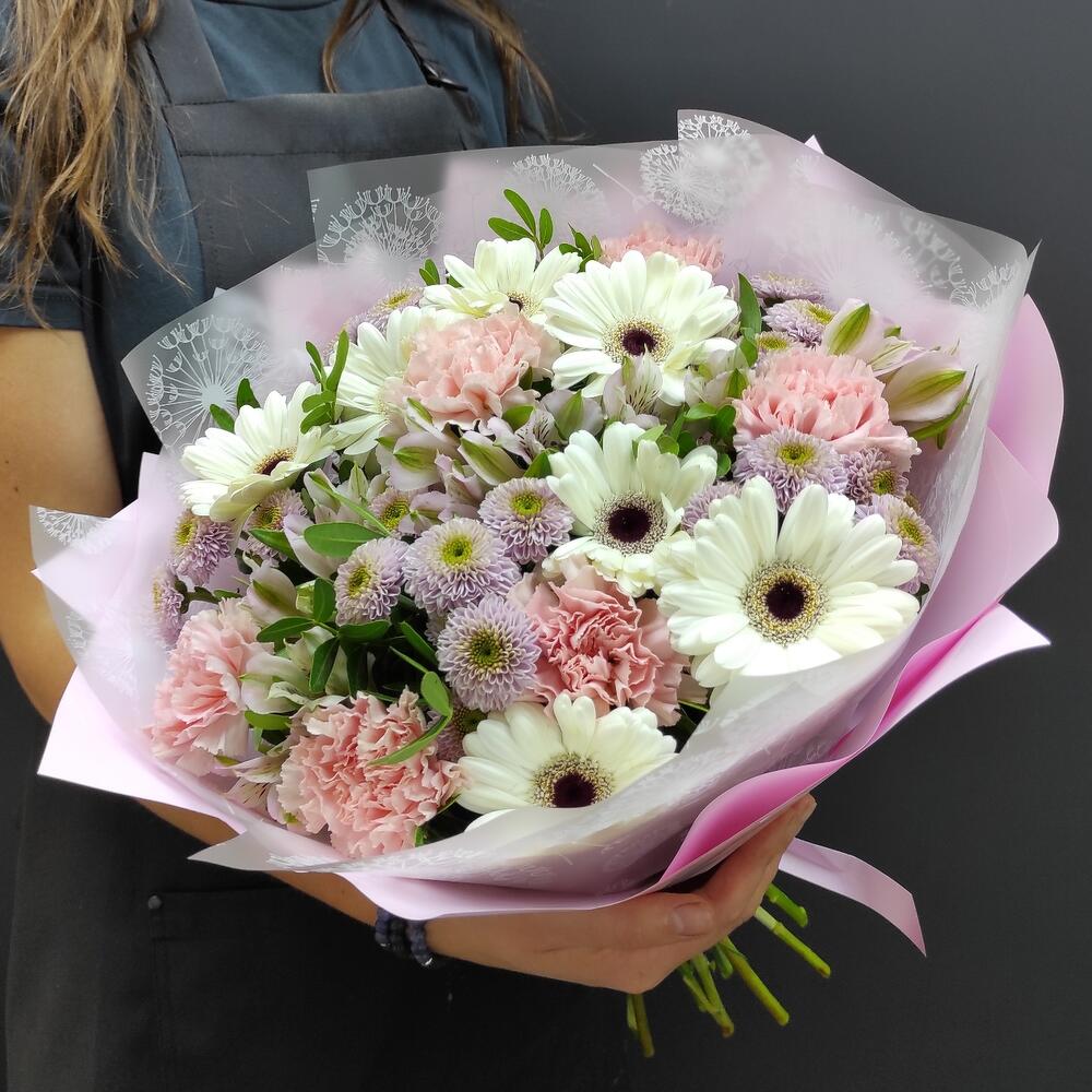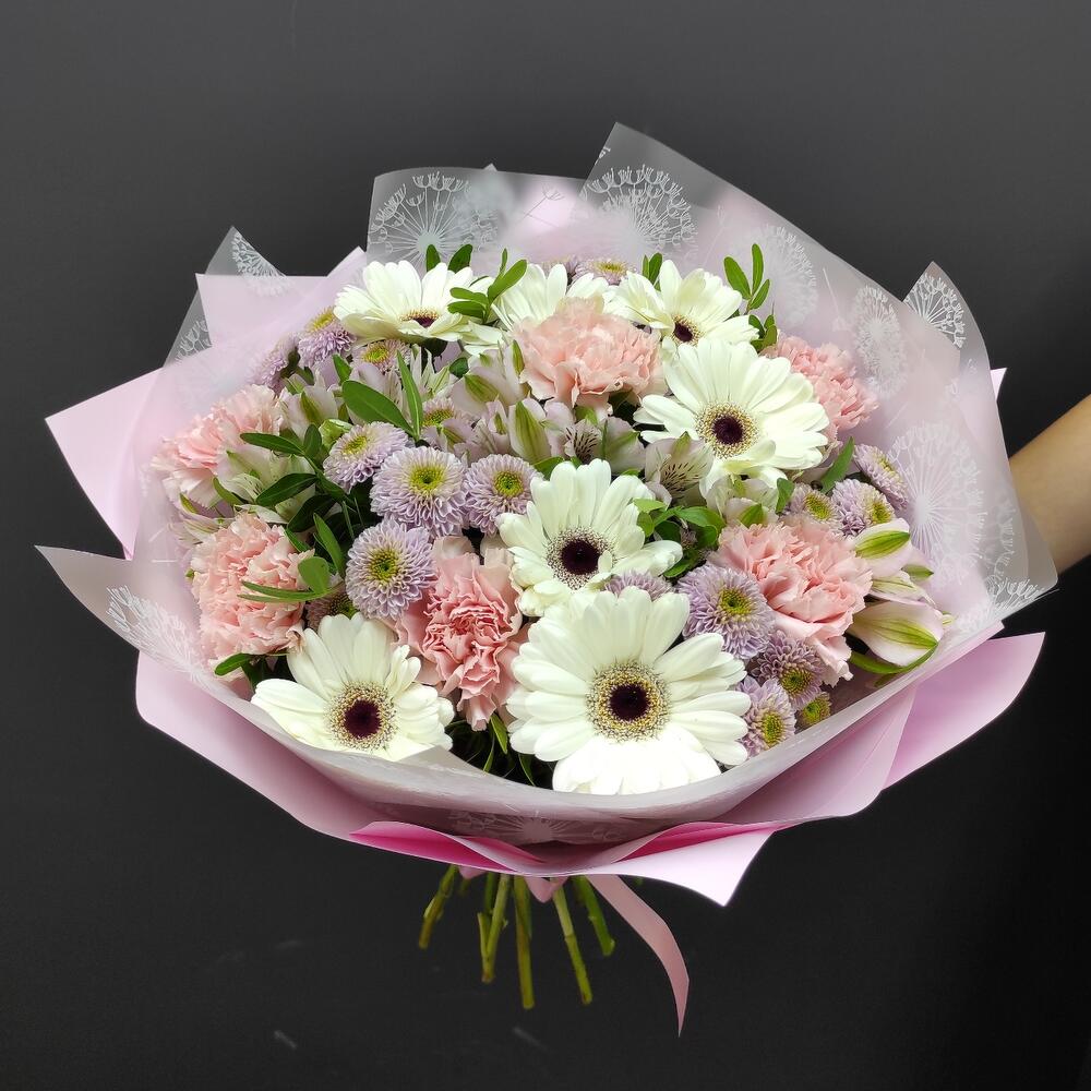 Гербера – 7 шт.Диантус – 6 шт.Альстромерия – 3 шт.Сантини – 5 шт.Фисташка – 3 шт.Пленка матовая – 1 шт.