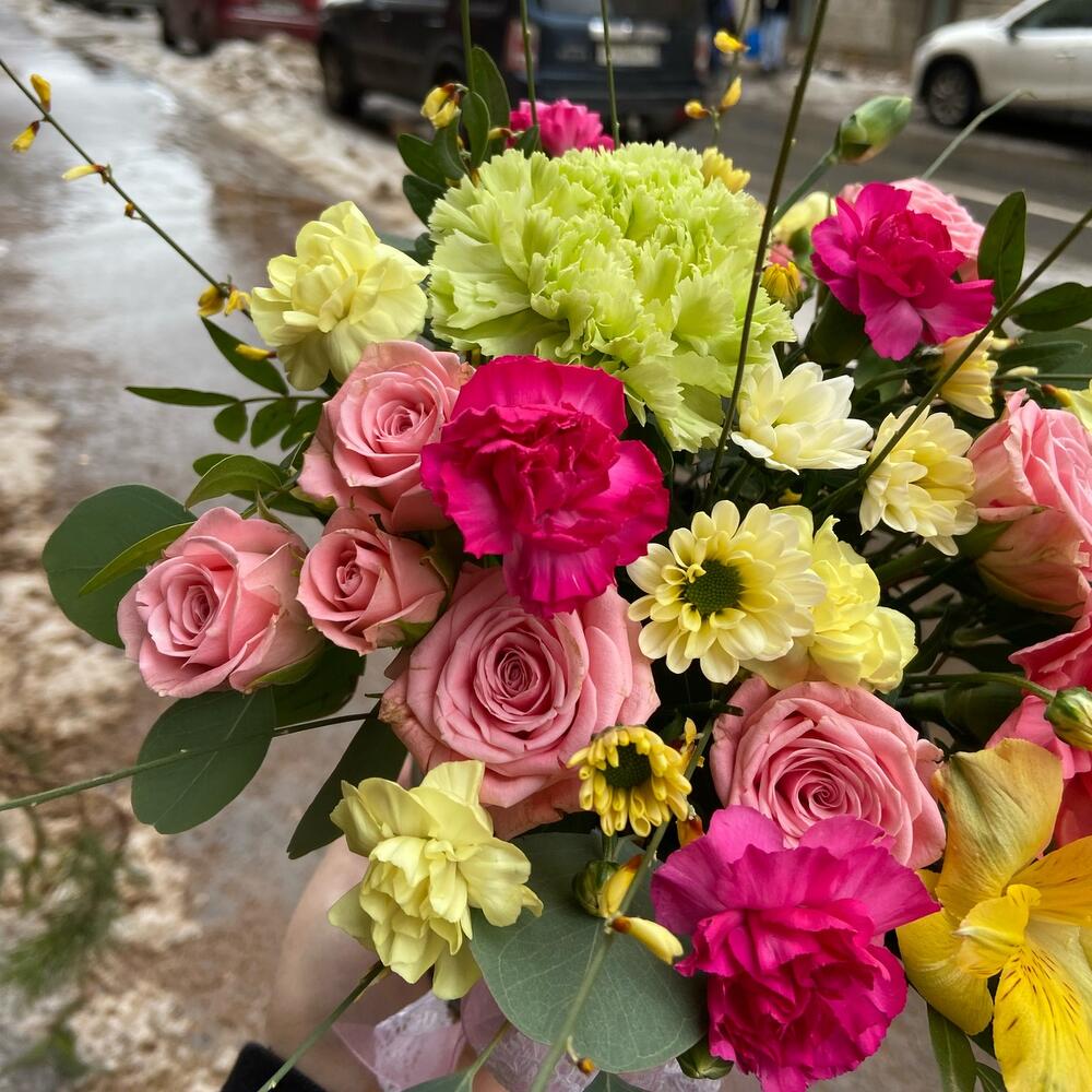металическое кашпо – 1 шт.Роза кустовая – 1 шт.Гвоздика – 3 шт.Гвоздика кустовая – 3 шт.Альстромерия – 1 шт.Гениста – 1 шт.ленты – 2 шт.Эвкалипт – 2 шт.