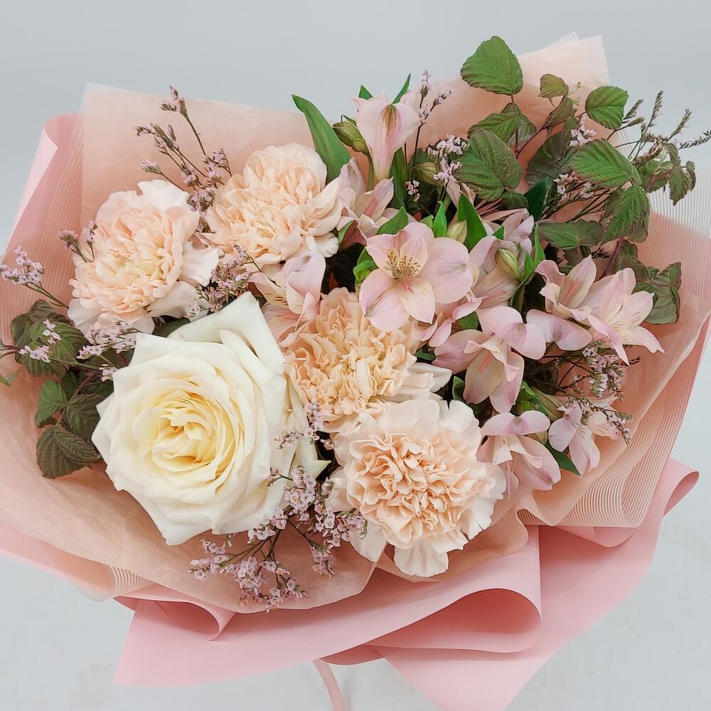 Лимониум – 2 шт.Зелень – 4 шт.Упаковка дизайнерская – 1 шт.альстромерия премиум – 2 шт.гвоздика сортовая (диантус) – 4 шт.роза пионовидная кэндллайт – 1 шт.