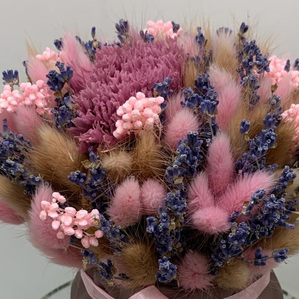 Ваза – 1 шт.гвоздика стабилизированная – 1 шт.Лаванда (сухоцвет) – 20 шт.Лагурус (сухоцвет) – 30 шт.сорго – 5 шт.