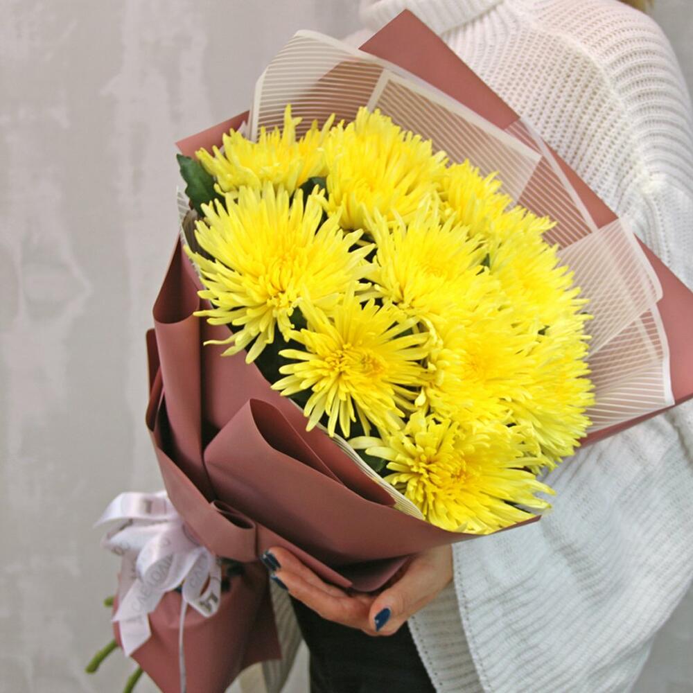 Букет из 11 желтых хризантем Анастасия в стильной упаковке