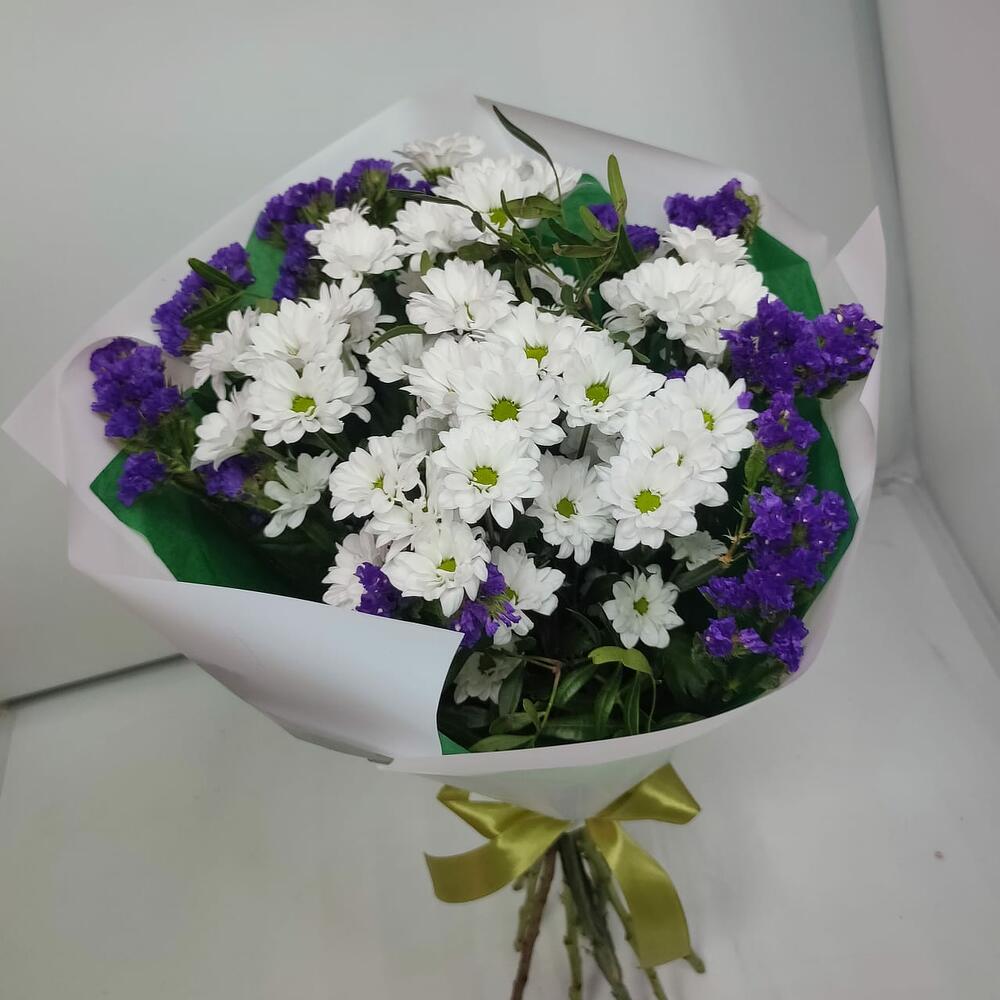 Хризантема кустовая Сантини – 7 шт.Статица – 2 шт.зелень фисташки – 1 шт.Дизайнерская упаковка – 1 шт.