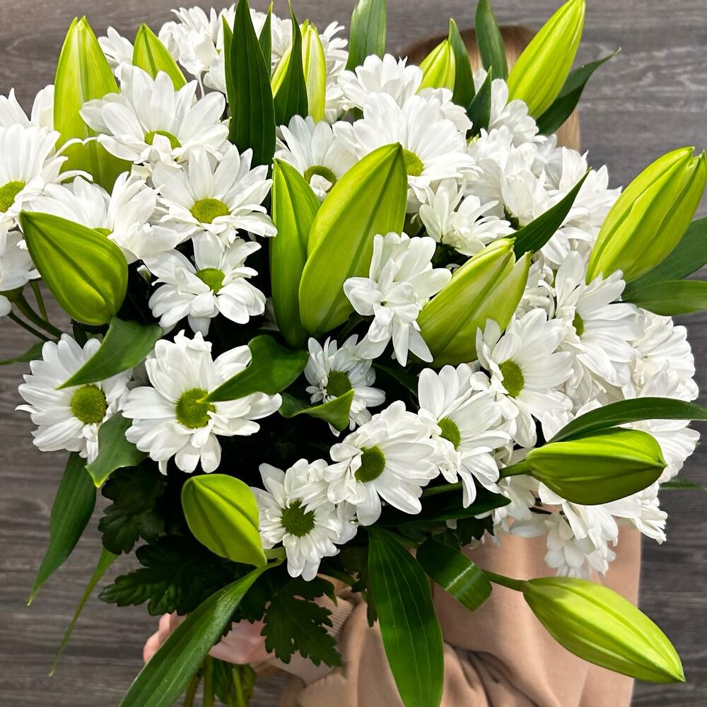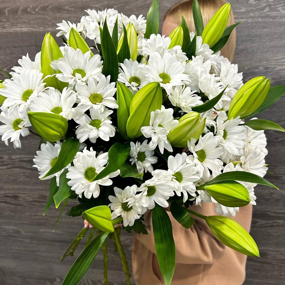 Букет из белой кустовой хризантемы и ароматной белой лилии