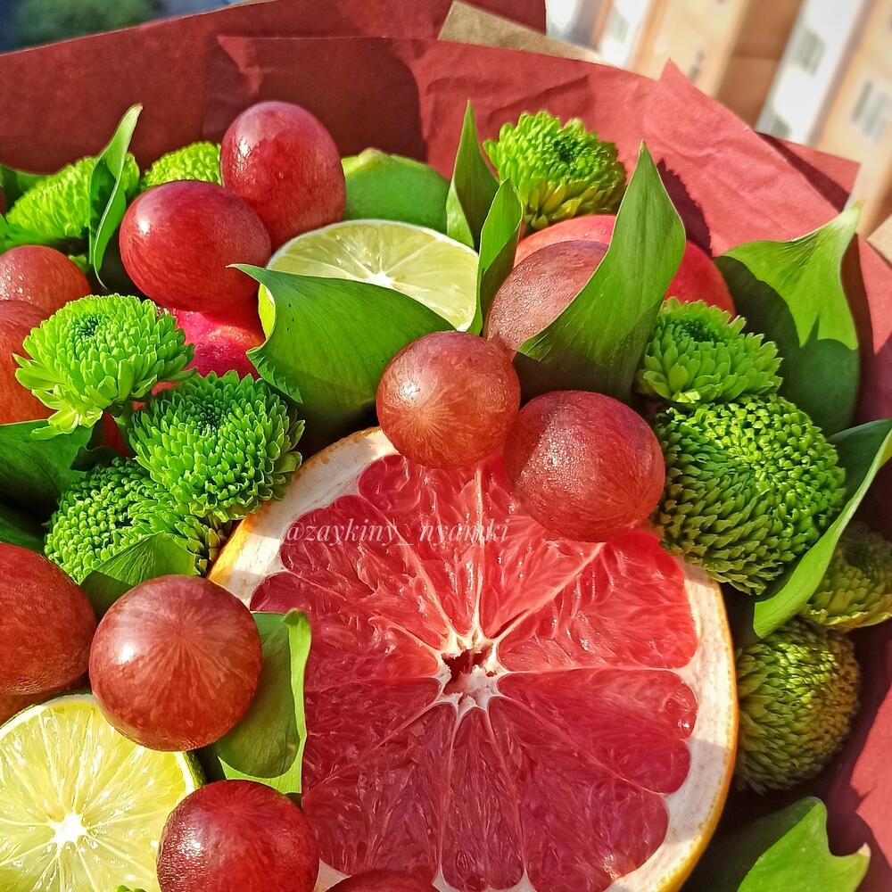 Хризантема Сантини – 3 шт.Лайм – 3 шт.Груша – 1 шт.Грейпфрут – 1 шт.Нектарин – 2 шт.рускус (зелень) – 5 шт.виноград ред глоб – 150 гр.