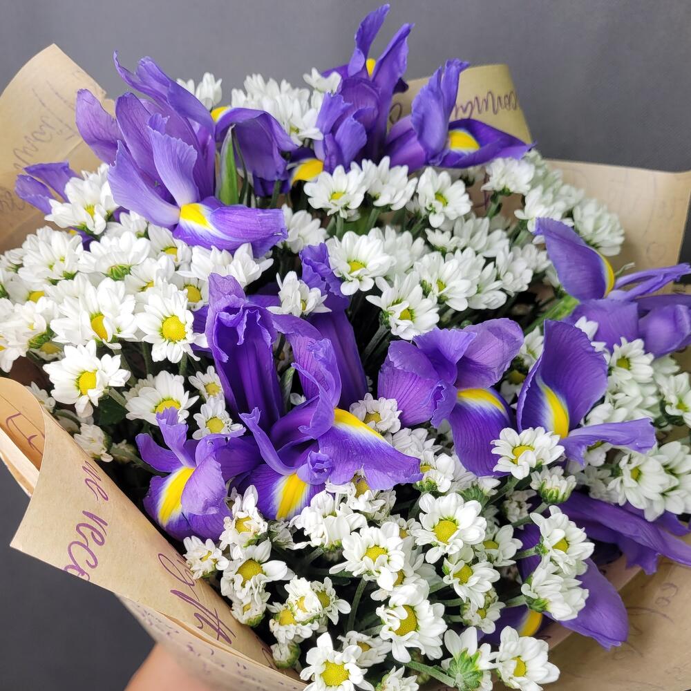 Хризантема кустовая Сантини – 6 шт.Ирис Blue Magic – 5 шт.Упаковка крафт – 1 шт.Джут – 1 шт.