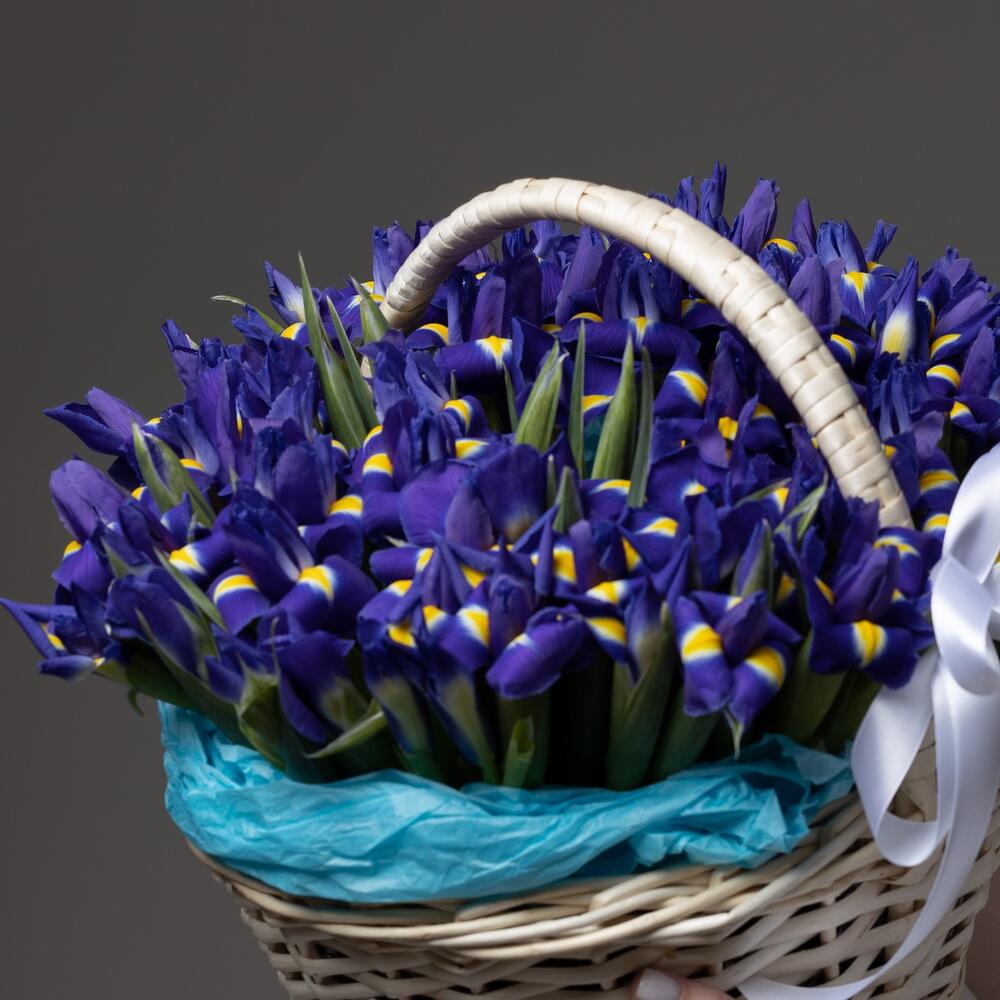 Ирис – 51 шт.Корзина плетеная – 1 шт.Лента атласная – 1 шт.Открыточка с вашими пожеланиями – 1 шт.хорошее настроение – 100 шт.инструкция по уходу за цветами – 1 шт.Кризал – 1 шт.
