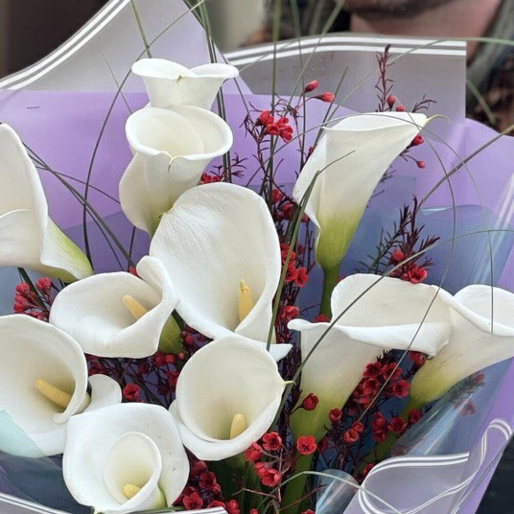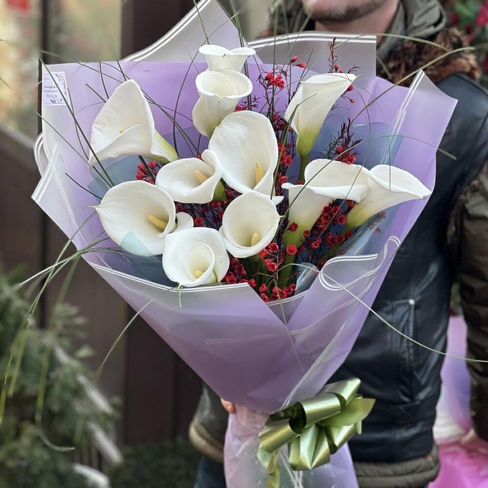 Калла – 11 шт. Хамелациум – 3 шт. Берграсс – 1 шт. Упаковка дизайнерская – 8 шт. Лента – 1 шт.