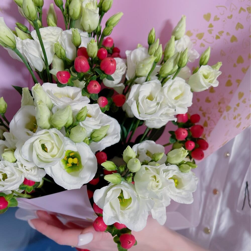 эустома белая – 5 шт.Гиперикум – 2 шт.Упаковка дизайнерская – 1 шт.Лента – 1 шт.
