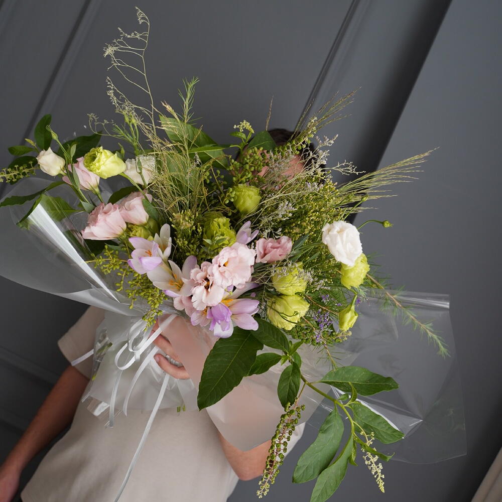 Гвоздики, Лизиантусы, Розы, Тюльпаны