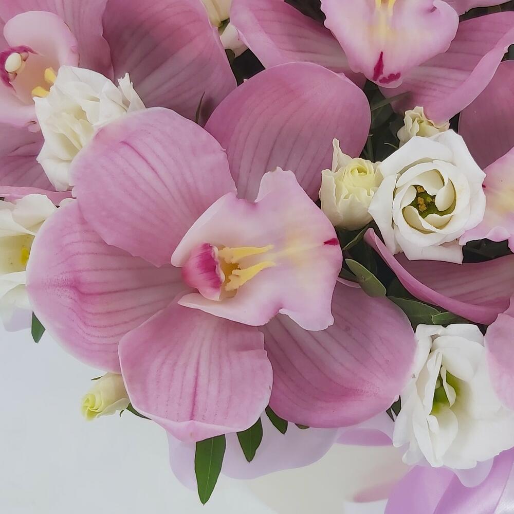 Розовые орхидеи с эустомой в коробке
