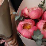 5 коралловых пионов с эвкалиптом
