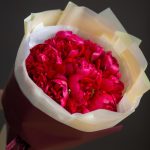 Атласная лента – 2 шт.Пион бордовый – 11 шт.Корейская пленка – 2 шт.тишью белая – 1 шт.