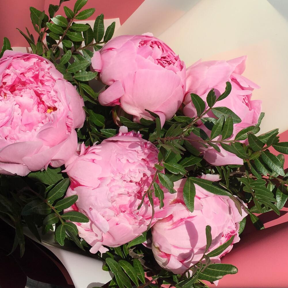 Букет из 5 пионов с зеленью