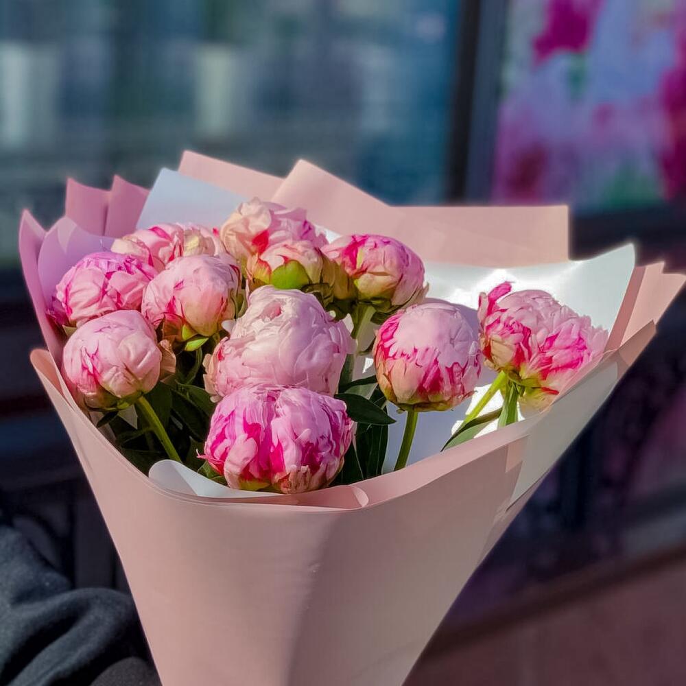 Пион Сара Бернар – 11 шт.Упаковка дизайнерская – 1 шт.Лента атласная – 1 шт.