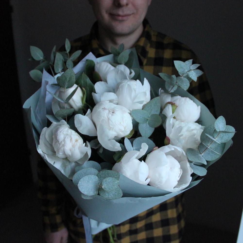 Моно букет из девяти белых пионов, с веточками эвкалипта, в лаконичной упаковке.Стильное цветочное решение для любого случая.