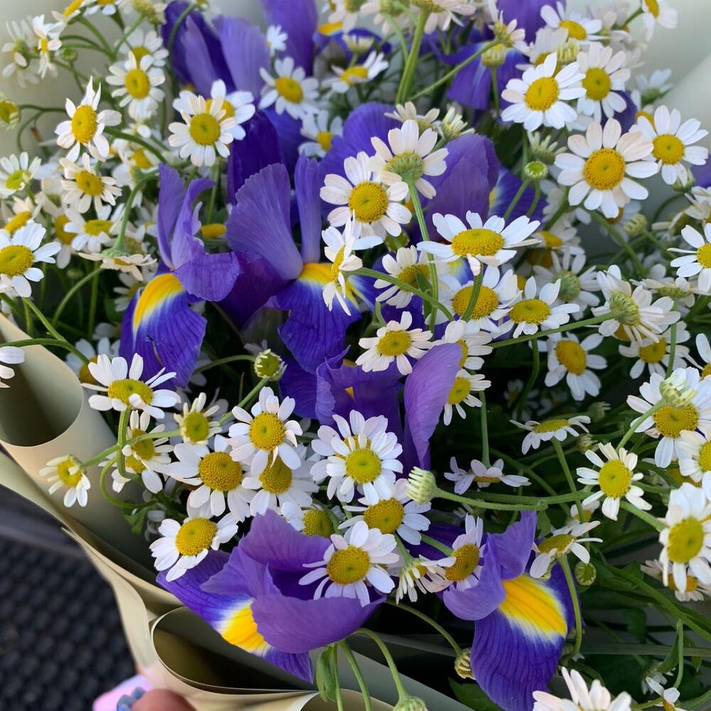 Ромашка кустовая – 6 шт.Ирис – 7 шт.Упаковка дизайнерская – 1 шт.Лента атласная – 1 шт.