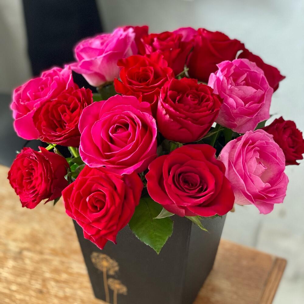 Зелень – 2 шт.Коробка шляпная – 1 шт.Роза одноголовая микс – 25 шт.Губка флористическая – 1 шт.
