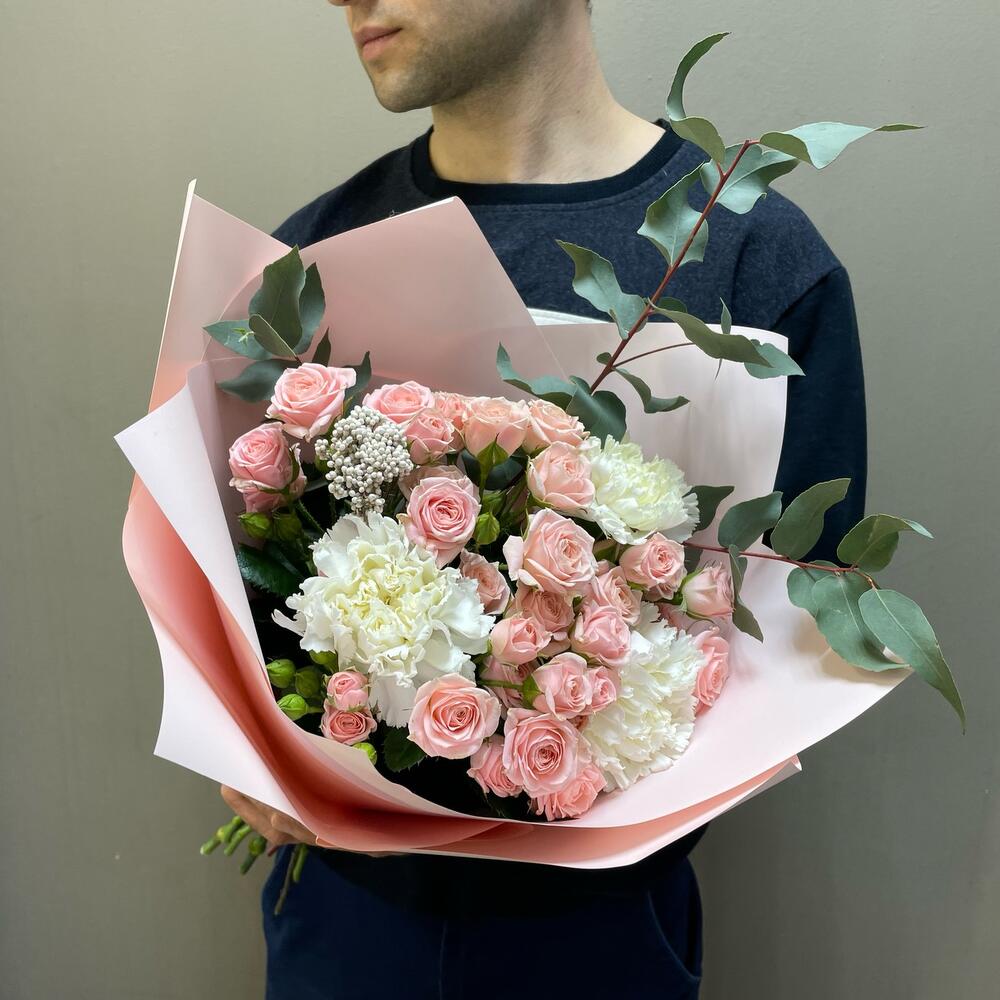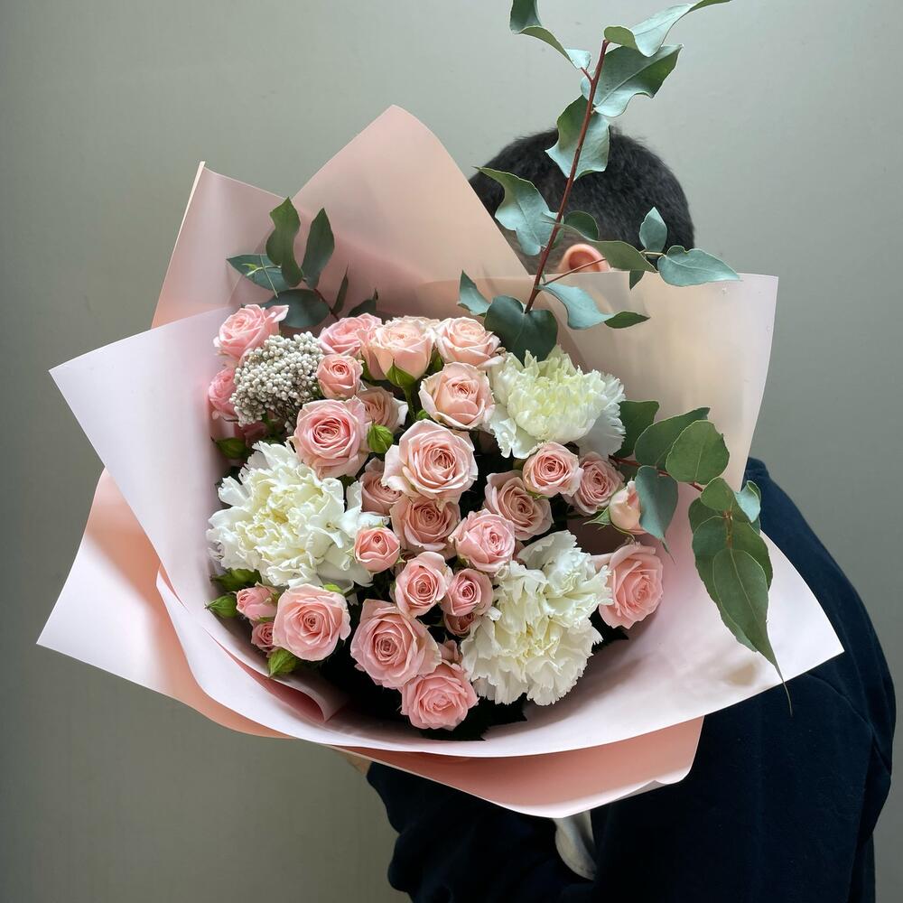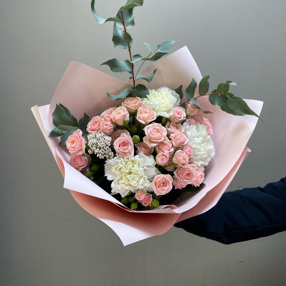 Авторский букет с кустовой розой,диантусами и эвкалиптом