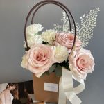 роза квиксенд – 3 шт.Диантус – 6 шт.Эвкалипт – 3 шт.ветки декоративные – 2 шт.Оазис флористический – 1 шт.Корзина – 1 шт.Лента атласная – 1 шт.наклейка фирменная – 1 шт.