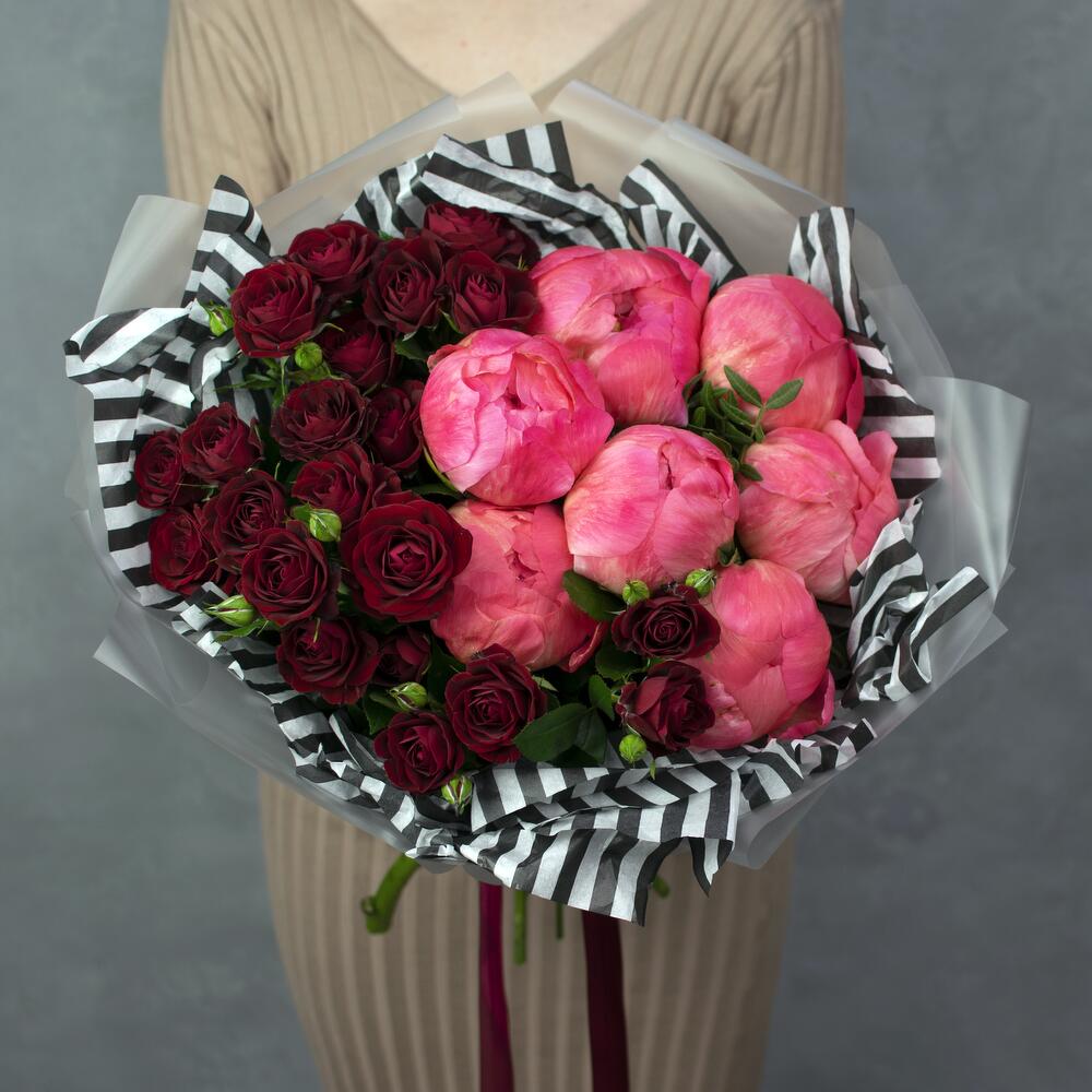 пионы Коралл шарм – 7 шт.Роза кустовая красная – 4 шт.