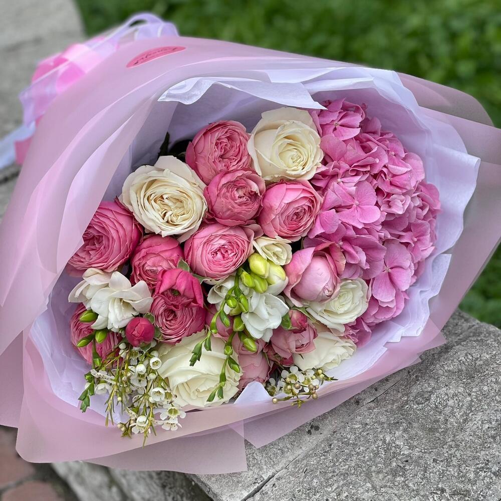 Альстромерии, Гортензии, Кустовые розы, Лизиантусы, Розы, Хризантемы