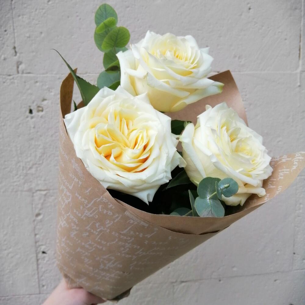 роза кендллайт – 3 шт.Эвкалипт – 1 шт.Упаковка крафт – 1 шт.Лента – 1 шт.