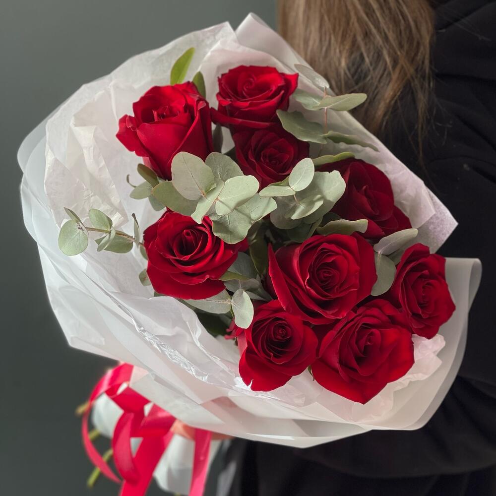 Эвкалипт – 2 шт.Роза одноголовая – 9 шт.Лента атласная – 1 шт.Упаковка дизайнерская – 1 шт.Тишью белое – 2 шт.