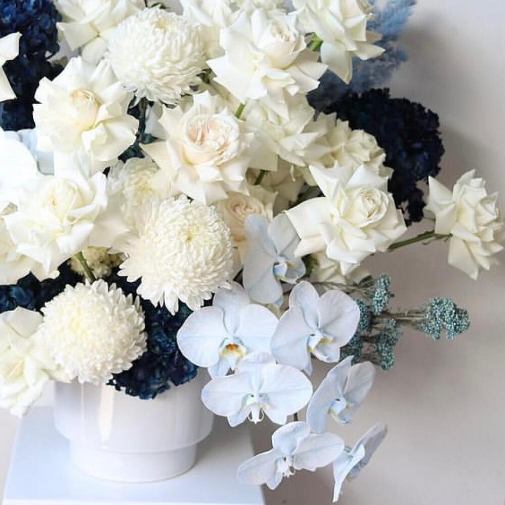 орхидея – 4 шт.Гортензия синяя – 5 шт.Хризантема – 5 шт.Роза белая – 31 шт.Упаковка дизайнерская – 1 шт.Лента атласная – 2 шт.Открытка – 1 шт.инструкция по уходу за цветами – 1 шт.хорошее настроение – 100 шт.коробка переноска – 1 шт.Кризал – 1 шт.Гипсофила – 5 шт.Сухоцветы – 5 шт.