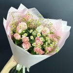 Букет кустовых розовых роз с матрикарией