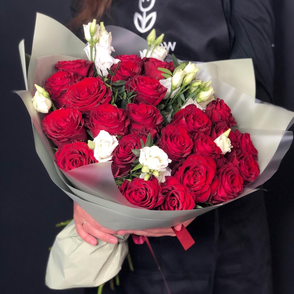 Роза – 25 шт.Эустома – 4 шт.Фисташка пучок – 5 шт.Крафт упаковка – 5 шт.