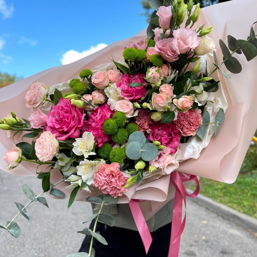 Альстромерии, Гвоздики, Кустовые розы, Лизиантусы, Розы, Хризантемы
