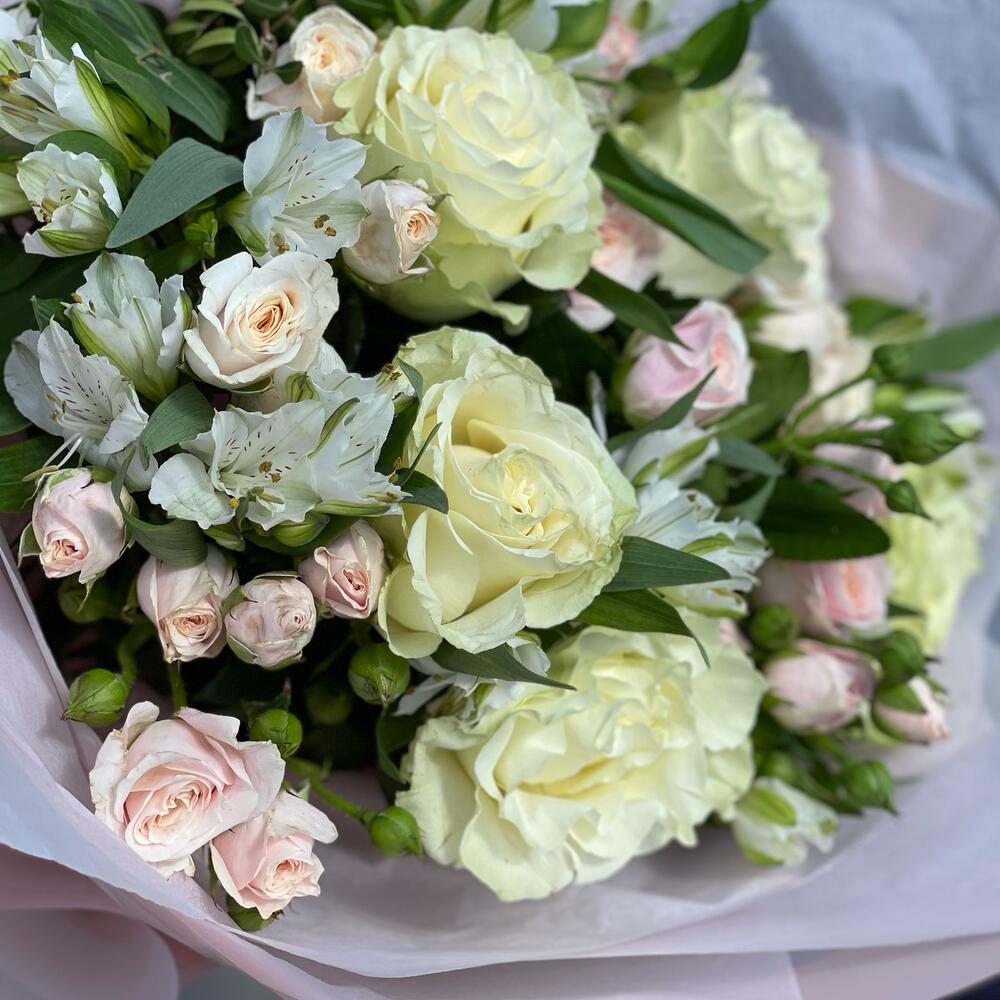 Роза – 5 шт. Альстромерия Микс Европа – 3 шт. Роза кустовая – 3 шт. Писташ – 5 шт.