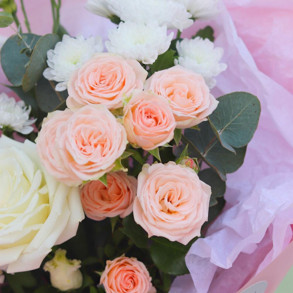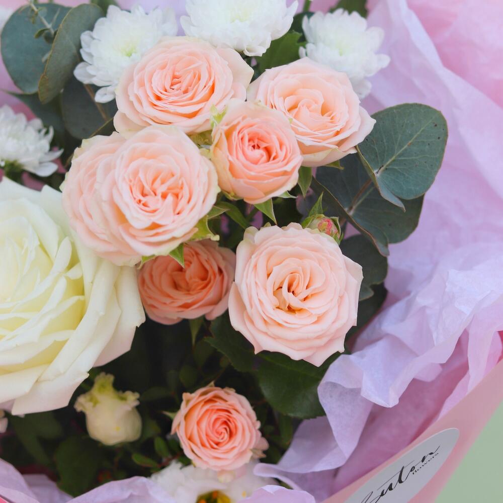 Роза пионовидная – 1 шт.Роза кустовая – 1 шт.Лизиантус – 1 шт.Сантини – 2 шт.Гвоздика – 2 шт.Эвкалипт – 1 шт.Дизайнерская упаковка – 1 шт.Открыточка с вашими пожеланиями – 1 шт.Шоколадка – 1 шт.