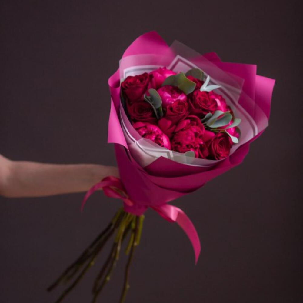 Атласная лента – 2 шт.Корейская пленка – 2 шт.пион red sharm – 5 шт.эвкалипт cinerea – 4 шт.кенийская красная роза 50 см – 6 шт.