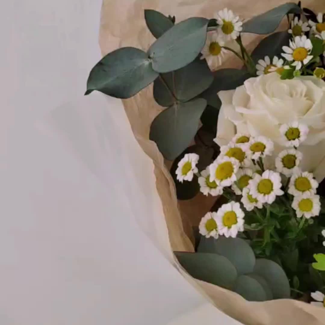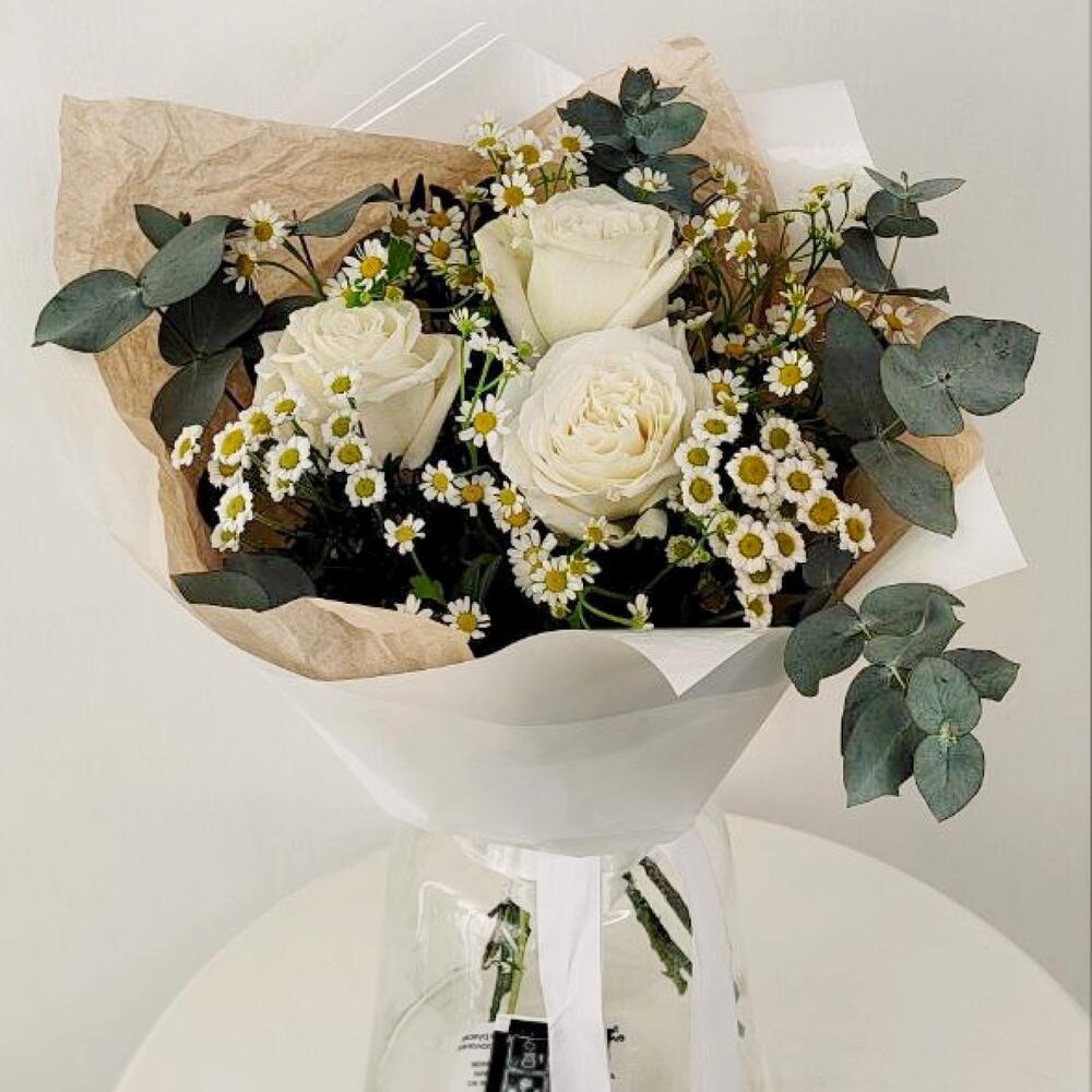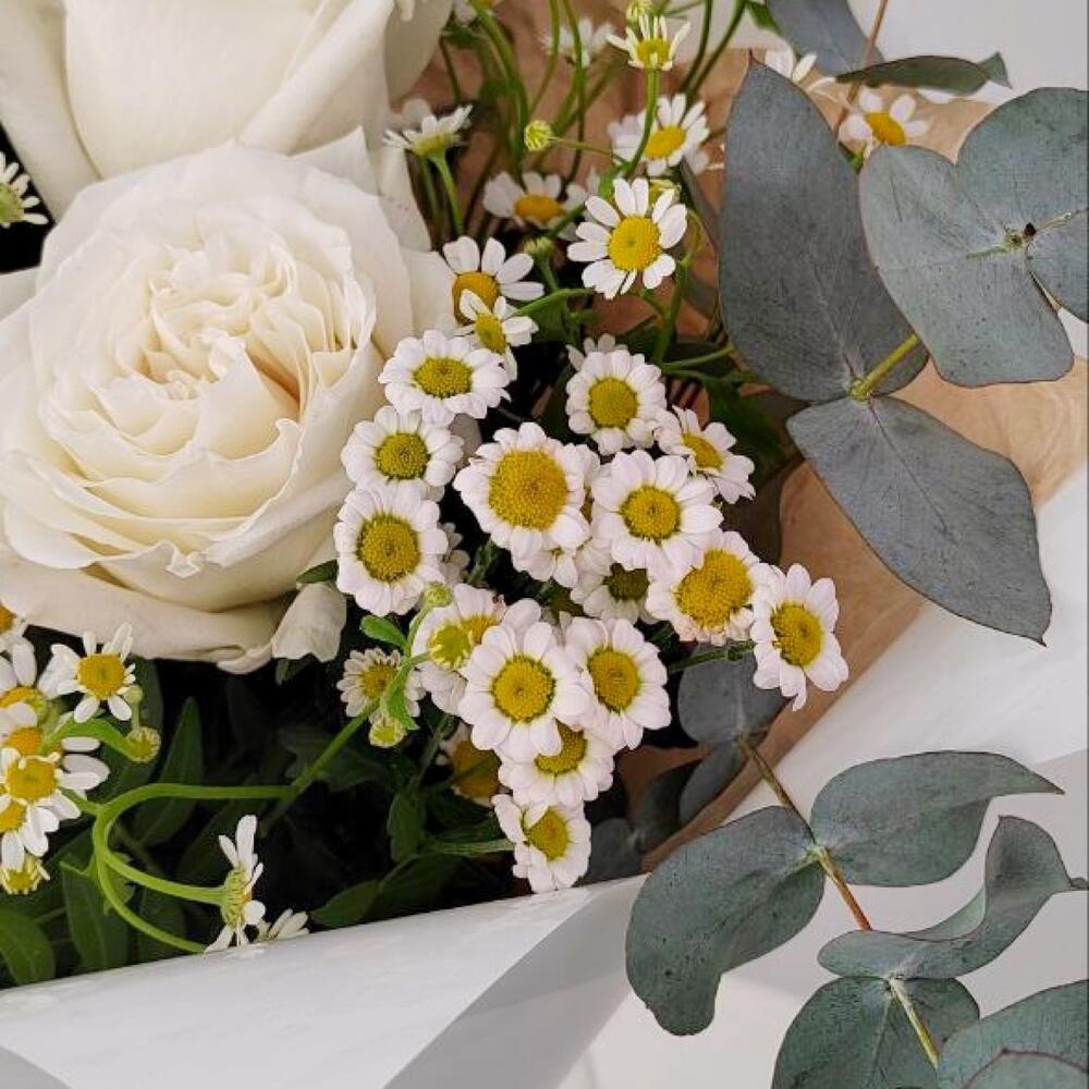 Эвкалипт – 2 шт.Ромашка кустовая – 4 шт.Упаковка дизайнерская – 4 шт.Лента атлас – 4 шт.Роза белая эквадор – 3 шт.фисташка зелень – 3 шт.