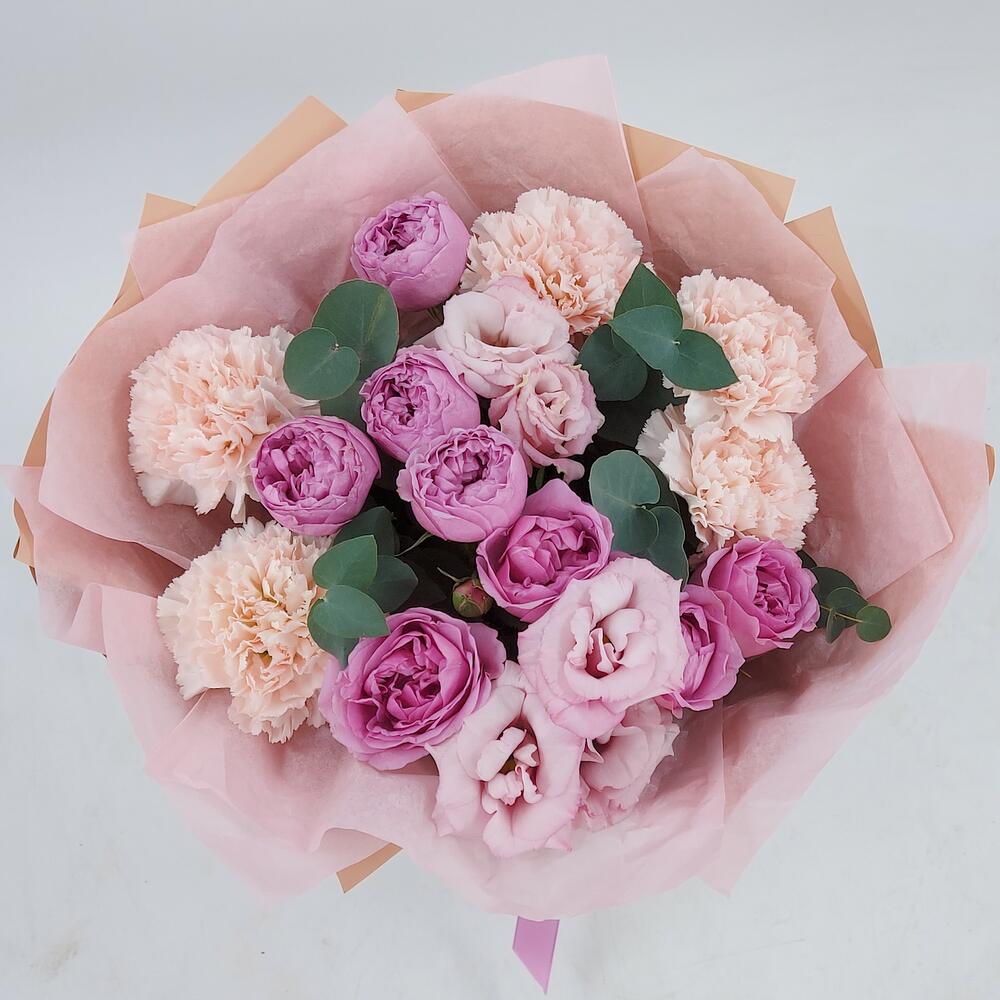 Букет с кустовыми пион. розами, эустомой и диантусами