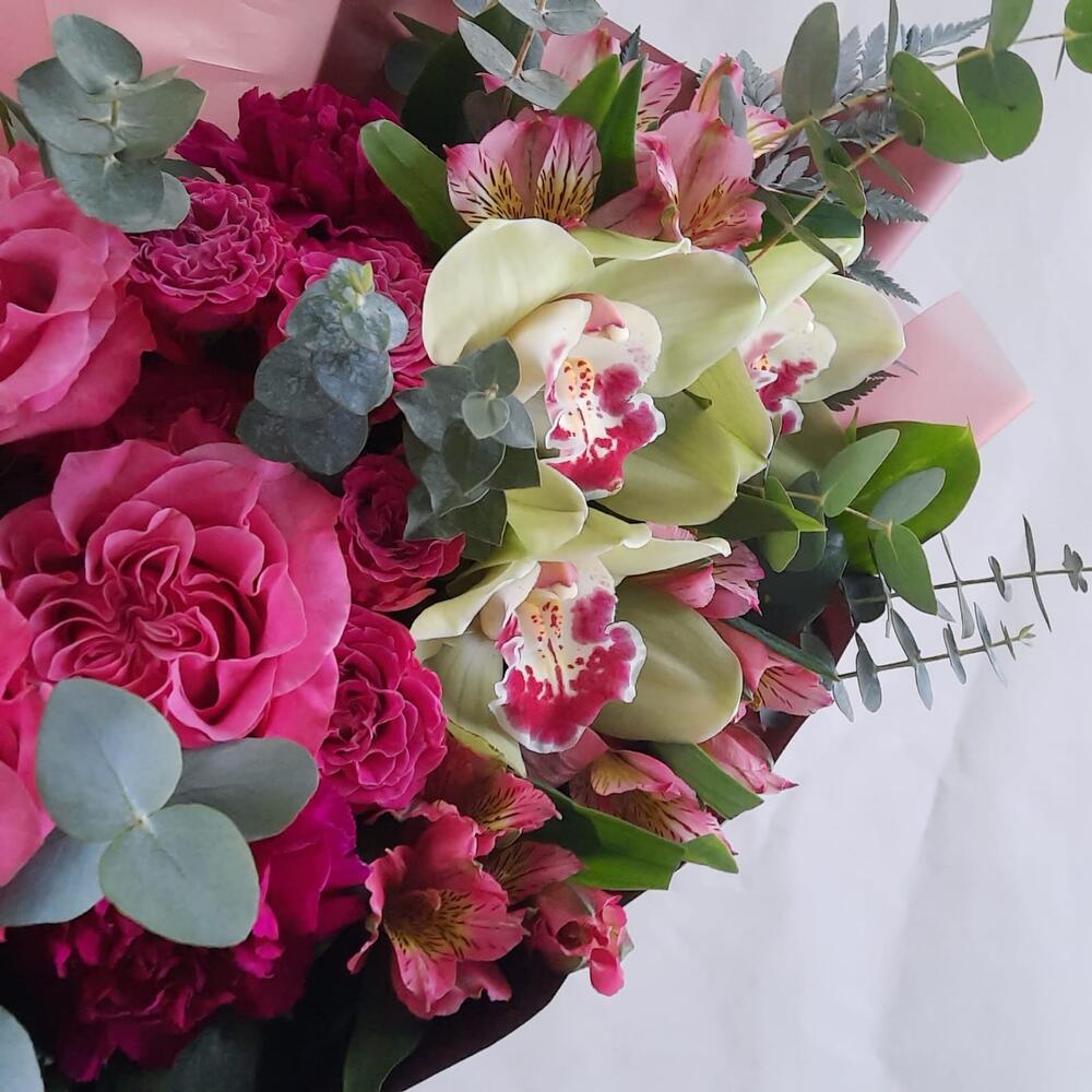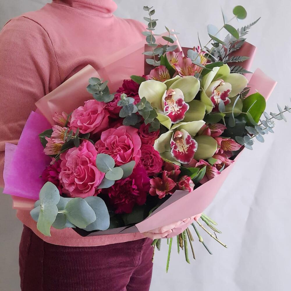 Роза кустовая – 2 шт.Альстромерия – 4 шт.Диантус – 3 шт.Орхидея Цимбидиум – 3 шт.Роза – 3 шт.Эвкалипт – 4 шт.Рускус – 13 шт.Упаковка дизайнерская – 2 шт.Лента атласная – 1 шт.