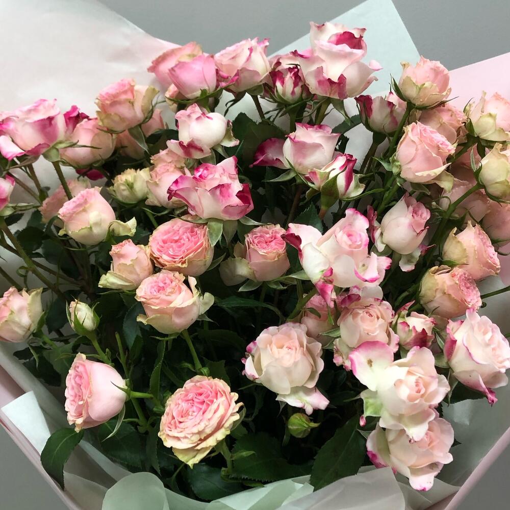 Роза кустовая – 9 шт.Тишью – 1 шт.Пленка матовая – 1 шт.Лента атласная – 1 шт.