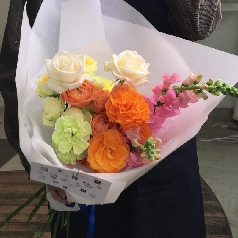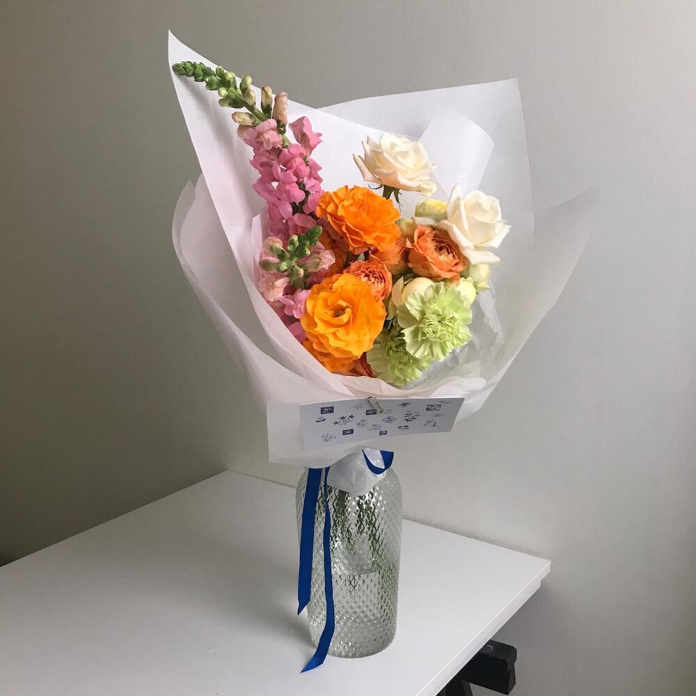 Роза кустовая – 4 шт.Хризантема кустовая – 1 шт.Гвоздика – 2 шт.Роза белая – 2 шт.Роза садовая – 5 шт.антиринум – 2 шт.