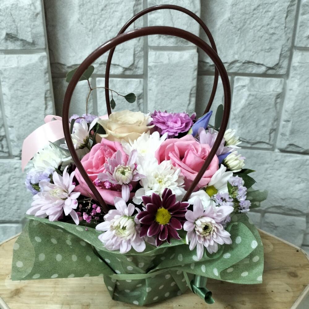 Букет в сумочке, удобно дарить, легко ухаживать и 0.5 воды через день.